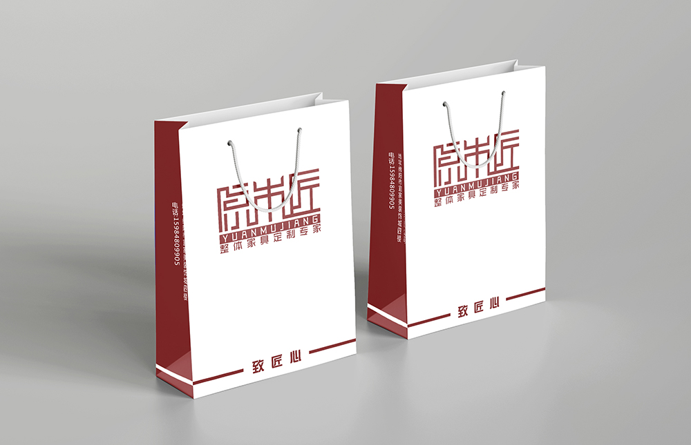 設(shè)計(jì)理念:本款家具手提袋設(shè)計(jì)以簡(jiǎn)潔為主,以白色為主體顏色,正面以紅色logo“原木匠”突出主題,紙袋兩側(cè)邊放置公司定制、名稱(chēng)、電話、二維碼等信息。