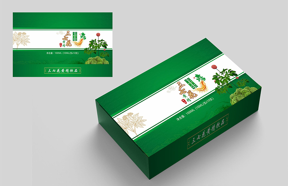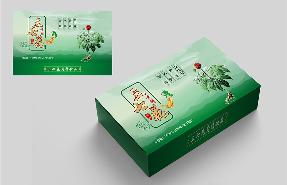 設(shè)計理念:本款包裝主要是打造一款“三七花黃精飲品”的保健產(chǎn)品品牌,包裝盒經(jīng)過重新設(shè)計之后,無論是從版式結(jié)構(gòu)上,還是色彩搭配上都融合了產(chǎn)品的品牌形象。整個包裝盒以綠色為主色調(diào),正面以三七花、黃精、人參、雪蓮等原材料圖片作為宣傳實物圖,創(chuàng)意文字與圖片進(jìn)行結(jié)合,最終進(jìn)行規(guī)范和統(tǒng)一,這些內(nèi)容信息都是以保健行業(yè)發(fā)展的角度進(jìn)行考慮到的。