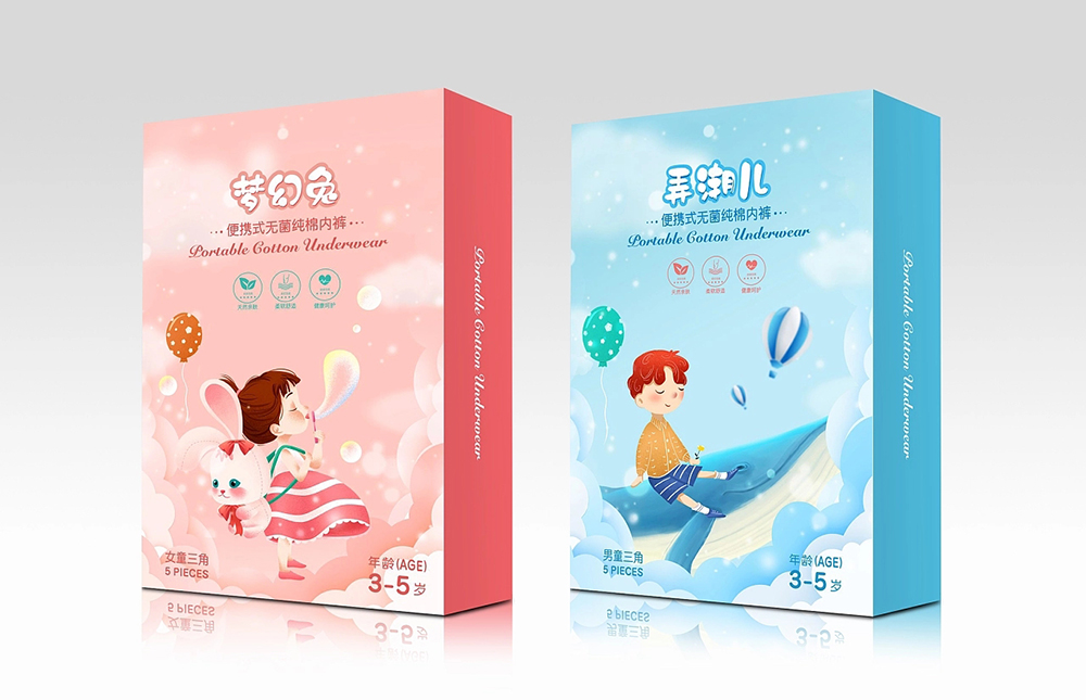 設(shè)計(jì)理念:本款包裝是兒童內(nèi)褲外包裝,包裝盒封面設(shè)計(jì)大膽的采用了卡通形象繪畫形式,其設(shè)計(jì)以夸張、提煉的手法再現(xiàn)原型,形象即可以滑稽、可愛,也可以嚴(yán)肅、莊重。外包裝上的簡(jiǎn)潔、逗趣的卡通形象會(huì)激發(fā)兒童對(duì)產(chǎn)品的興趣。很多企業(yè)也關(guān)注到消費(fèi)者群體年輕化的發(fā)展趨勢(shì),故此希望借助產(chǎn)品包裝上的卡通形象來吸引消費(fèi)者,打造自己獨(dú)特的品牌文化,以個(gè)性的包裝定制進(jìn)一步擴(kuò)大產(chǎn)品的市場(chǎng)份額。